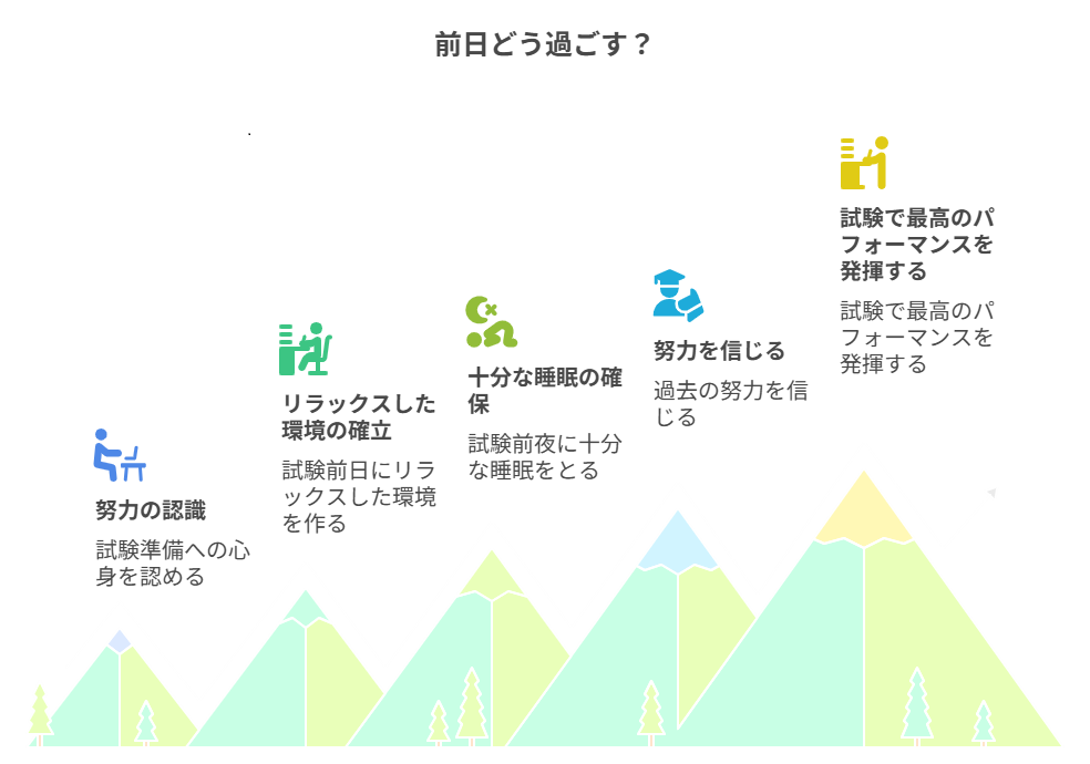 4度の受験からいえる事は、「試験前は勉強で追い込んでいた日々よりもリラックスできる環境を整え、しっかりと睡眠する」ことが重要です。