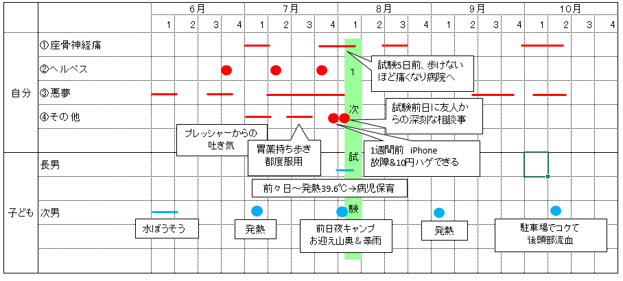 ①座骨神経痛:学習時間を、週25時間→週40時間にした7月あたりから、座骨神経痛を発症。勉強のし過ぎが原因って自分頑張ってるやん、とMの境地でたまの通院。しかし1次試験5日前に足を引きずらないと歩けないほどになり病院へ、何とか収まる。