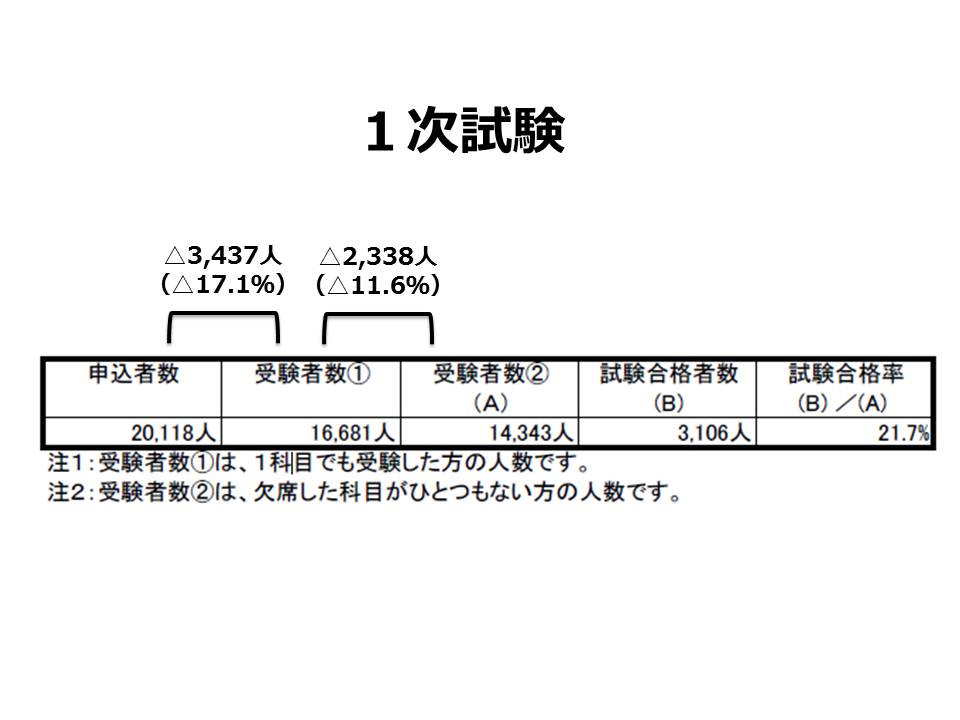 さらに受験者数①から受験者数②(全科目受験)は、14,343人へと2,338人(11.6%)も減少しています。これは、科目合格制度を戦略的に活用している受験者がいることの現れだと思われます。