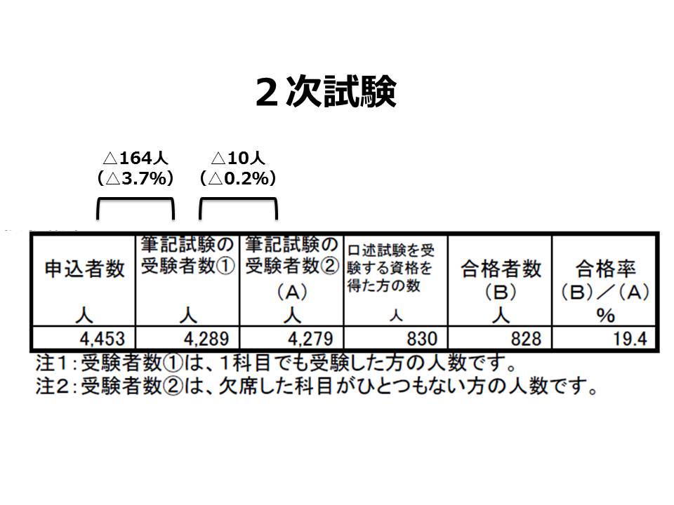 そして、この受験者数②(全科目受験)のうち830人が2次筆記試験を通過し、合格率19.4%となっています。