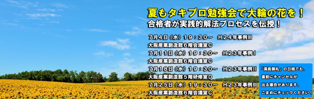 今年もタキプロ関西は「合格者・受験生参加型のみんなで創る勉強会」をキャッチフレーズに、二次試験対策のための勉強会を開催します。