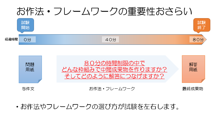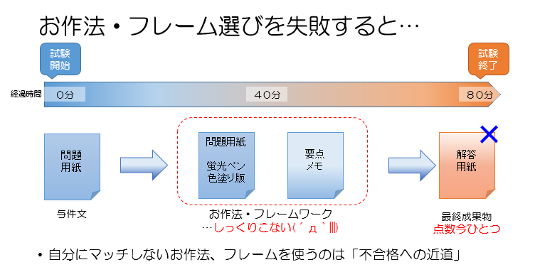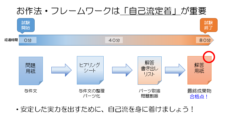 ここで話をする「自己流」とは、「自分にあった試験時間中のプロセス」を指します。「お作法」や「フレーム」と表現する場合もあります。