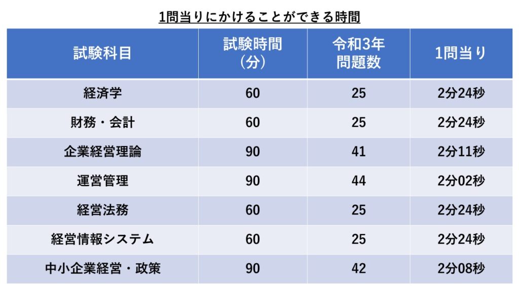 下の表に試験時間と問題数をまとめましたが、運営管理と中小企業経営・政策以外は2分以内に解答すれば余裕ができます。