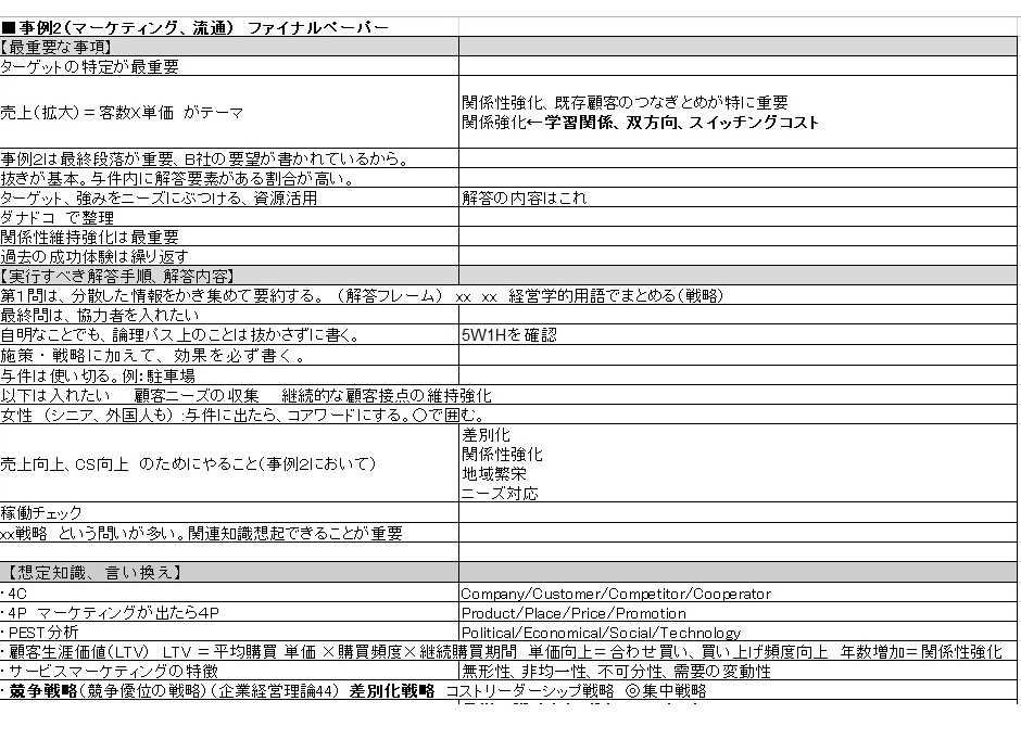 私は、ファイナルペーパーを事例毎に作成、更新することで、事例毎の違いの理解や、経験が積み重なって、解答品質の安定につながるメリットがあったと思います。