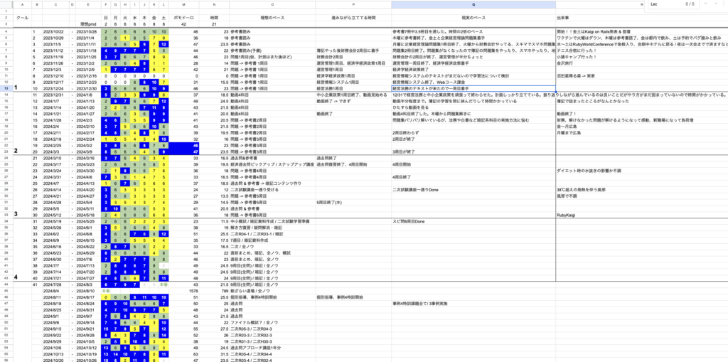どれくらいの学習をしたか、スプレッドシートにおおまかですが記録しておきました。やってみると、「今までどれくらい勉強してきたか」が心の支えになりました。