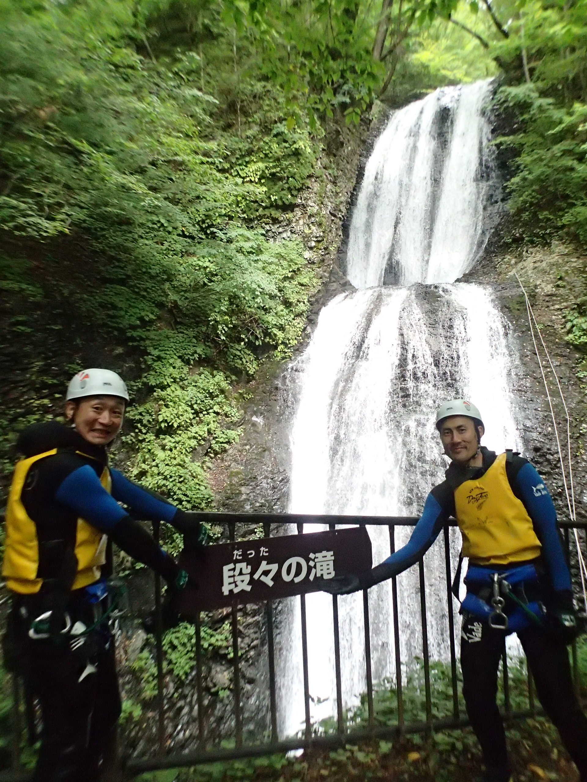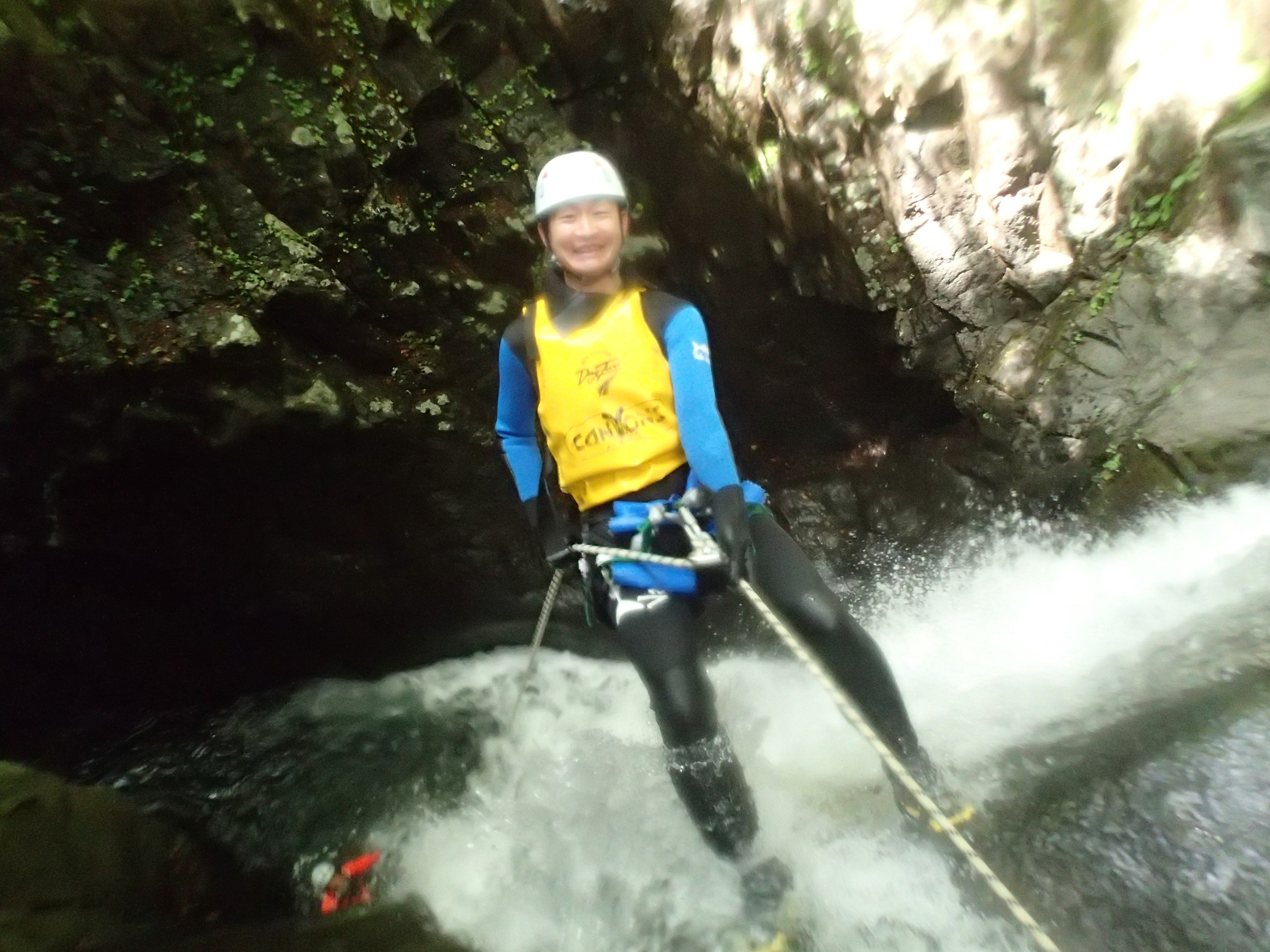 振替コースは懸垂下降(自衛隊や消防隊がビルからロープで高所から降りる方法)が多く、最後は落差35m(ビル10階分)の滝を懸垂下降してきました!