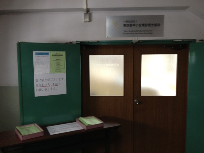 ビルに入るとすぐに受付があります。「診断士一次試験の申込書をもらいたい」と話すと7階だと教えてもらえました。7階でエレベーターを降りて、すぐ右に、目指していた東京都中小企業診断士協会があり、申し込み用紙が写真のように段積みされています。