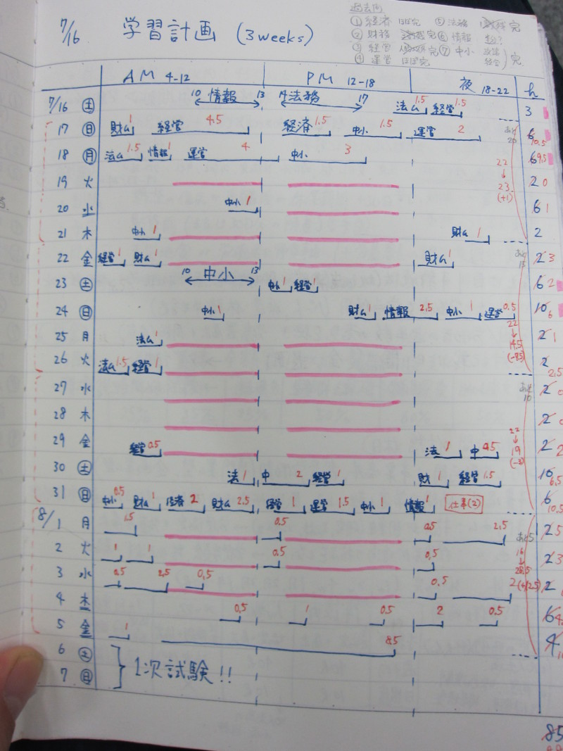 それを防ぐためにも、勉強は1日に3~4科目を回すようにしていました。(下の写真は、直前期の私の勉強スケジュールです)