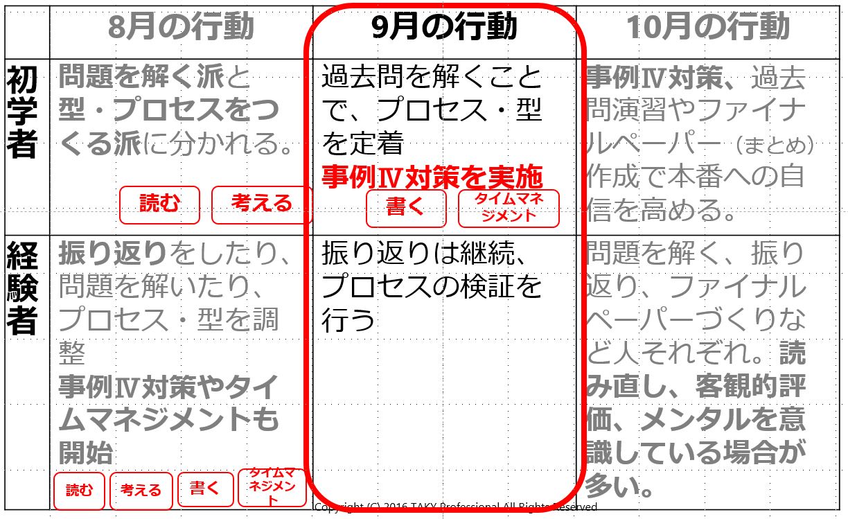 前段が長くなり、やっと本題ですが。前回と同様、タキメンアンケート結果から、「合格者のやっていたこと9月編」より