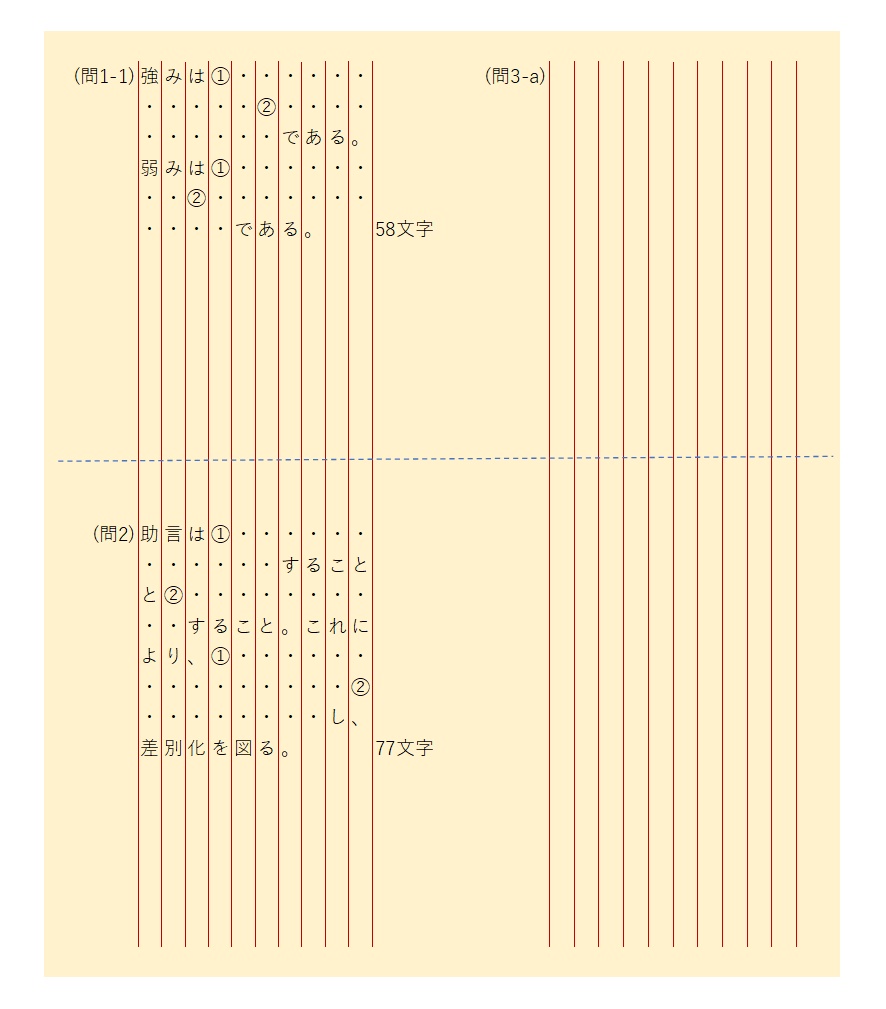 ワタクシは事例Ⅰ〜Ⅲでは、60分間でかなり精緻な下書きを作りました。 そんでもって、残り20分で心を無にして下書きから解答用紙に転記していました。