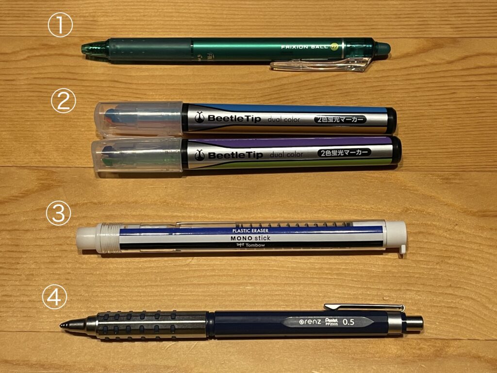 どうしても4色使いたかったのですが、普通の蛍光ペンでやろうとすると机が圧迫されるし、持ち替えがめんどくさすぎる状態になります。