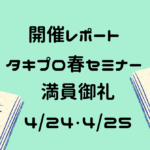 2021年5月1日 / 最終更新日時 : 2021年6月30日 ユーザタキプロ 1-2.タキプロセミナー ≪開催レポート≫ タキプロ春セミナー(4/24・4/25) こんにちは。タキプロ12期 セミナー班のみさ、でこぽんです。先日はブログ活用法についてお伝えしましたが、本日は春セミナーについてお伝えします。(ブログ活用法の記事はこちらから)(みさ、でこぽんの過去の掲載記事はこちら→誰 […]