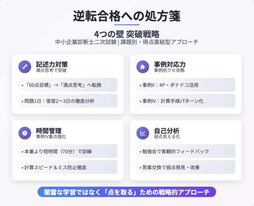 合格できた3年目において、「これらの課題は努力不足ではなく、勉強のアプローチ方法に原因がある」と考えました。次のセクションでは、これらの課題を克服するための具体的な「逆転合格戦略」をご紹介します。