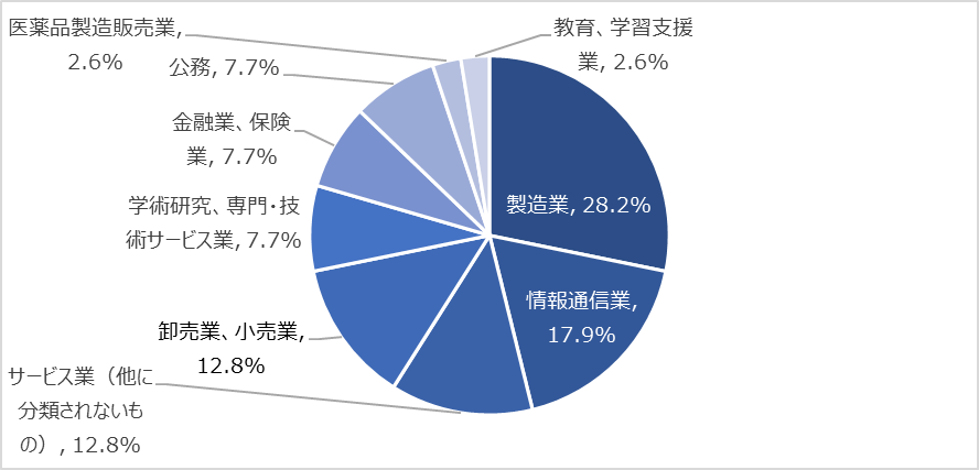 アンケート結果を見ると、製造業28.2%、情報通信業17.9%、サービス業12.8%、卸小売業12.8%となり、この4業種合計で7割以上を占めています。総務省統計局による労働力調査をまとめた、独立行政法人労働政策研究・研修機構の調査によると、2024年の産業別就業者数は、製造業15.4%、卸小売業15.4%、医療・福祉13.6%、建設業7.0%、サービス業6.9%と続きますので、タキプロメンバーには情報通信業の方の取得が比較的多く、逆に医療・福祉、建設業の方は0と、全人口で見た統計情報と異なることがわかりました。やはり中小企業診断士が、経営課題を解決するコンサルタントという仕事であることから、他社にシステム関連の提案を行う情報通信業の取得が多く、現場で作業を行う建設業や医療・福祉の方が少ないのかもしれません。私自身は金融業であり、金融業7.7%と思ったより低かったことに驚きました。