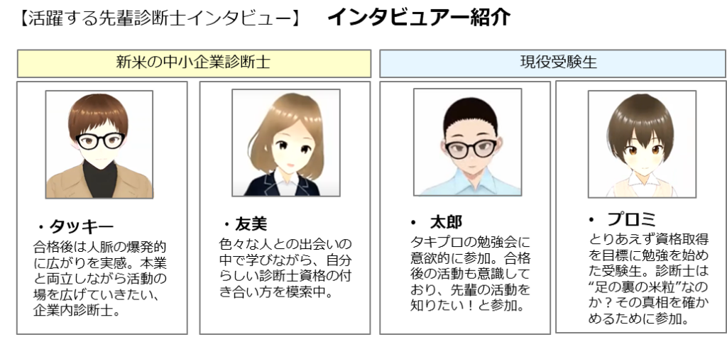 今回のタキブロ+はタキプロYoutubeチャンネルの人気コンテンツ「活躍する先輩診断士インタビュー」とのコラボ企画です。これまで10名の先輩診断士へのインタビューを振り返り、中小企業診断士の魅力や活躍するために大切なことをインタビュアー4名がシェアします!